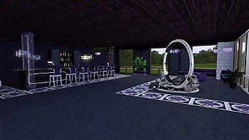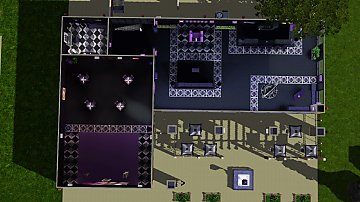 The right portion of the building contains the main lounge room, with a bar, gyroscopic conductor, and DJ booth, as well as some lounge seating. Past the hallway, in the back left corner is a small dressing room. At the front left of the lot is the performance room. The basement contains the restrooms.