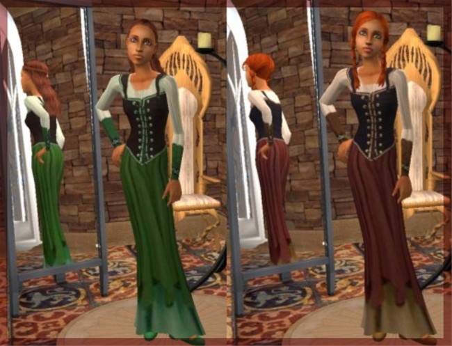 an over skirt and lighter underskirt, and arm bands with a celtic design. Great for a young milkmaid or an innocent woodcutters daughter.