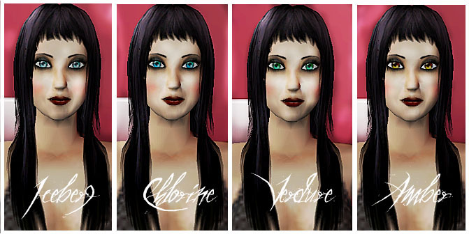 I think I did pretty well on these eyes, I like them more than my favourite custom eyes! <3 They come in four colours, Iceberg (greyish blue), Chlorine (blue), Verdure (green) & Amber (yellowish brown). You will have to download the zip file for all of them, or if you just want a certain one, just extract that one (they are all labelled packages).