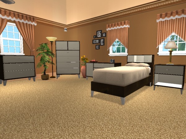This is a new bedroom set! It includes 2 dressers, a table, end table and a single bed. All new meshes! Enjoy! I decided to make a single bed because when ever I make double beds, people have problems with them, and single ones dont seem to have any problems.