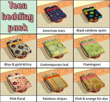 Are your teen Sims tired of having to choose from bedding that's really only suitable for kids or elders? With this new teen-geared bedding pack, your Sims can have fun, trendy patterns adorning their beds. While most of this pack is quite feminine, there are also a few beddings that would be suitable for guys as well. Enjoy!