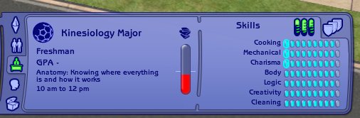 I tweaked the skills needed since this major is made for the athletic career. It concentrates on the 3 skills that the career uses plus cooking, since every Sim needs to know the basics in the kitchen. By the the time your Sim graduates he/she will have learned the following skills: