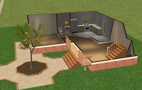 Notes: I only play-tested it briefly... the sims were able to use the stairs, the bathroom and sit on the bench. hehe..^o^ Also, you may note that the tile colors in the bathroom may be different in the picture than the game - as I was testing, I realized the kitchen and the bathroom had the same tiles so I repackaged it again. ^^;
