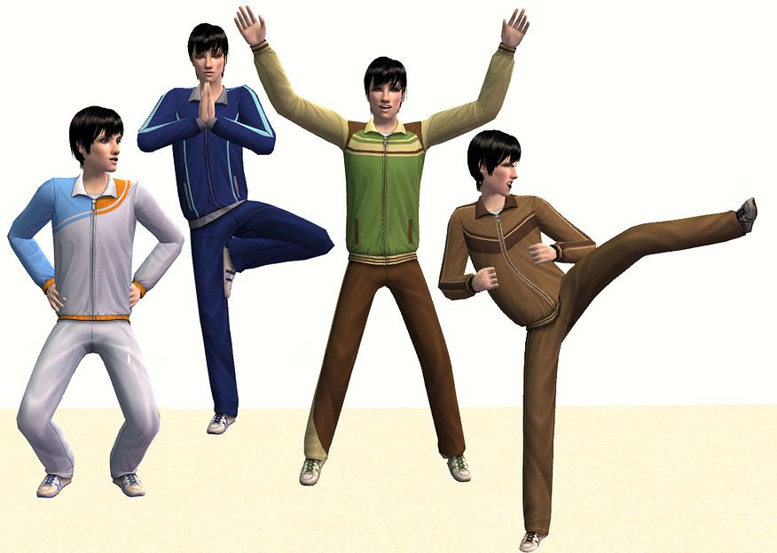 The outfit comes in the four original Maxis colours. All items can be found under Athletic; no expansion packs required.