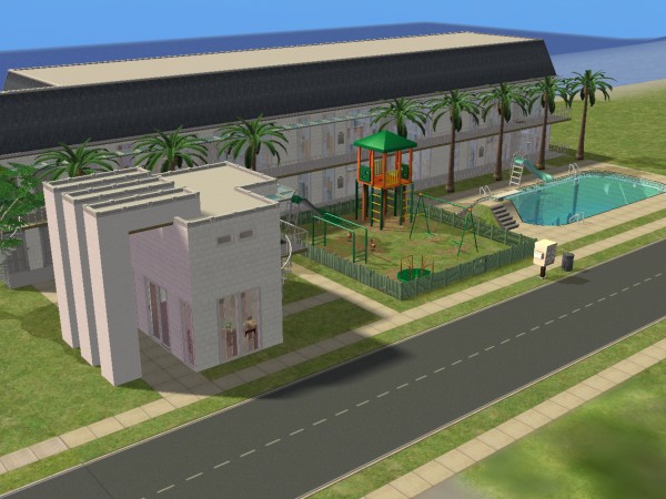 There is also a large pool with an elevated diving platform, (the animation is a bit screwy, but it looks cool!) a playground for the little'uns, and a common room with a bookshelf, poker table, and pool table. Above the common room is a small loft apartment for those sims who can't afford the bigger units.