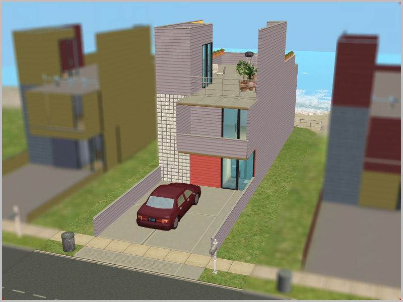 Compatibility: Requires all EPs up to and including Apartment Life (when I saw, what items this EP will have, I started to built this house and left free space for AL objects until I will get it. I also wanted to make 3 rowhouses as apartments, but apartments can’t have back door and can’t easily be build on beach lots. It just won’t be that, what I want). I have used few items from Kitchen & Bath SP, furniture in bedroom, living area, study and chairs around the house are from Ikea Home Stuff, there also are few decorative items from other SPs. But I didn’t use any build mode content from SPs, so if you don’t have all SPs up to and including Ikea Home Stuff (except Happy Holiday Stuff), use Sims2Pack Clean Installer to install lot and you will get house with some furniture in rooms missing, which you could replace with available items.