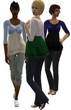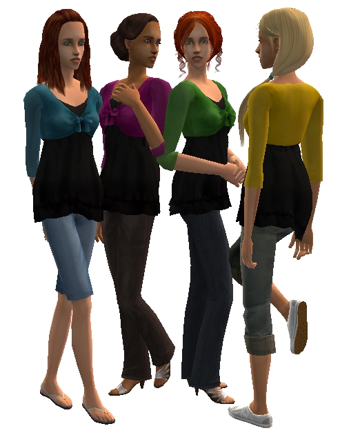 This is a new separate mesh for your ladies, a long, romantic babydoll with a bolero. You can ombine it with nearly all bottoms. It´s bumpmapped and has also a fat morph. If there are any problems, please report here. I only noticed that the top is a little bit "in the sim" when she makes a big move or so but that´s the problem with many meshes, right? So, there are 3 different sets of recolours. Every set has 8 recolours and the mesh included in the rar-file. Every single file is named clearly so you can pick up the outfits you want.