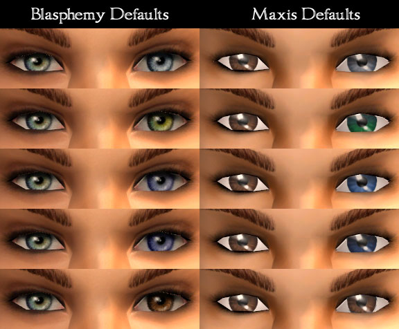 The Matched Mismatched Eyes can at least partially eliminate that need: these are recolours of the cyborg eye, but they adapt to your defaults. Instead of pointing to textures within the files themselves, they point to the five default eye colours. So if you use Maxis eyes, they will match the Maxis eyes. If you use default eyes, they will automatically pick up the textures for your default eyes, and use those instead, as shown in my screenshot using my Blasphemy Defaults. Switch defaults, and they will change too, without you having to download anything more, or do anything different. Neat, huh?