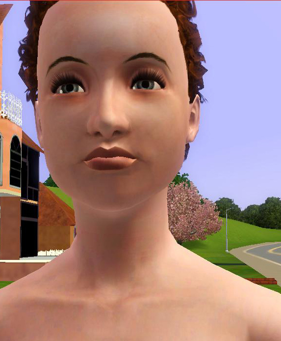I tried to add a bit of hair follicle texture to the brows (hand-drawn by yours truly, just so you know) so they wouldn't look so drawn on. Of course the game renders all textures badly, but if you zoom in close you can see my hard work
