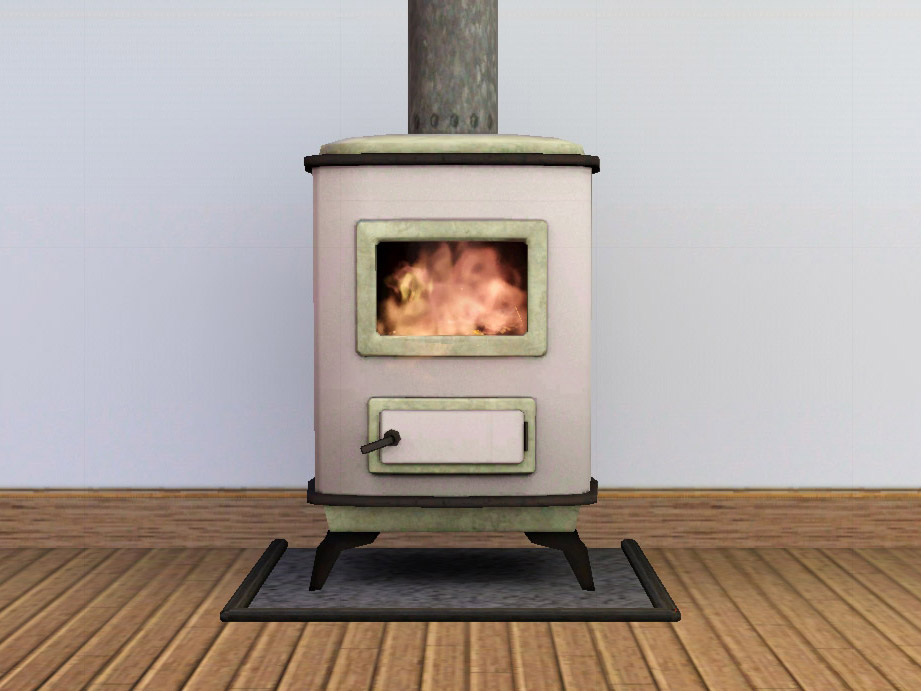 The stove is moved further back to the wall than the original one, so the fire is quite far in front now – flames will often appear to come out of the window, which looks a bit dangerous. (I know that a stove like this would normally have a door .. but sims can't very well poke a fire through a closed door, so I pretend that my sims are all slobs and have lost the door somehow).