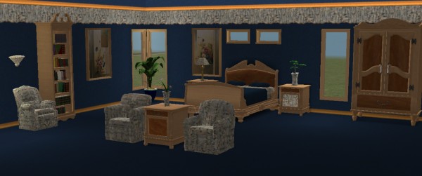 Hi, here is my first attempt at creating a matching bedroom. The set includes an armoire, bed frame, bedding, nightstand with two fronts (one imitates a solid mahogany panel), bookcase, recliner, two paintings, window, flower, wall sconce lamp, table lamp, and wallpaper.