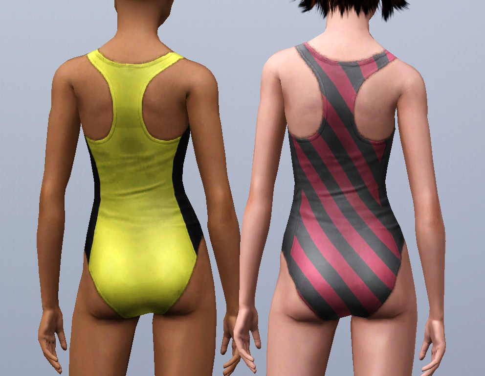 Two sporty one piece swimsuits for young adult and adult females. Both are in one package file together and appear on the same row in Create-a-Sim. They're similar but a little different. The zippered suit has three color channels, and the one without the zipper has only two. The color combos shown above are the presets for each suit.