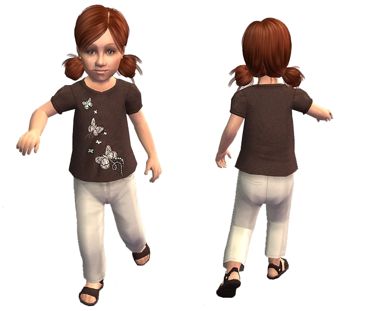 Here's an outfit for all your toddler girls. Brown short-sleeved shirt with butterflies, white pants and brown sandals.