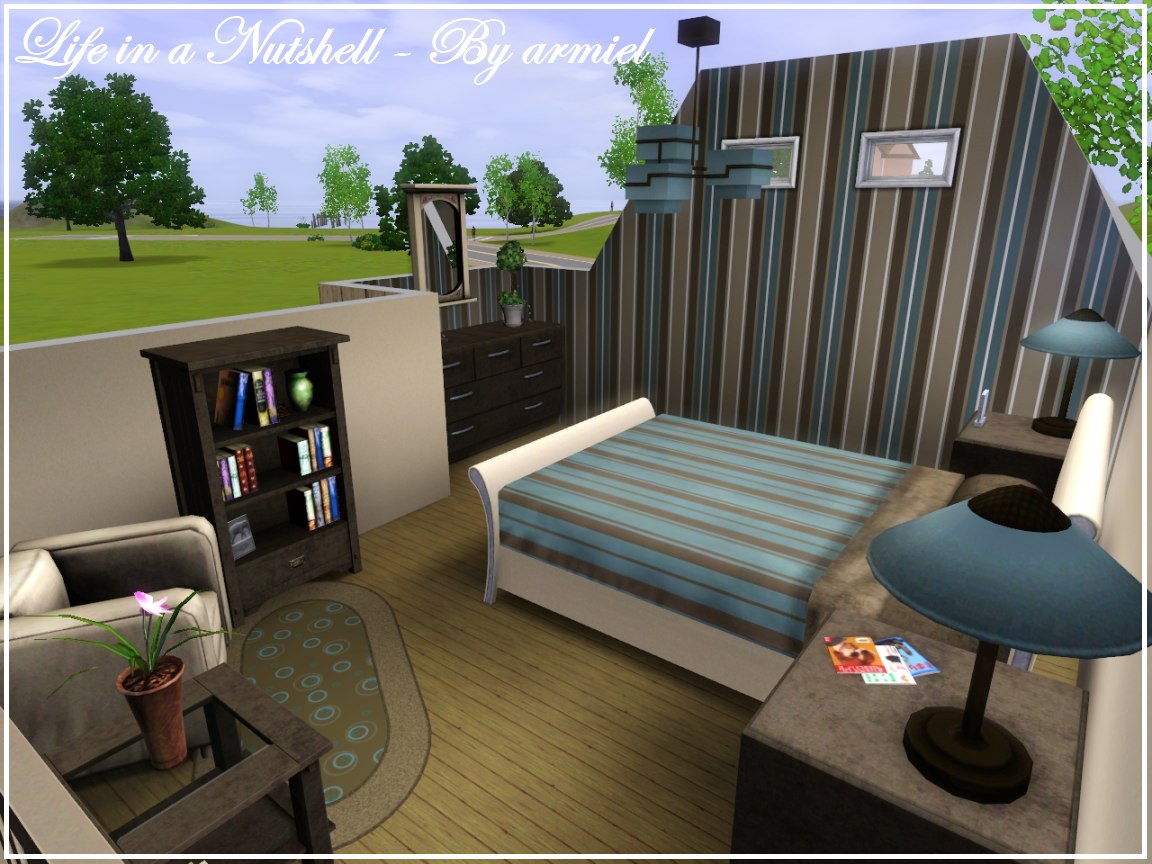 Life in a Nutshell is indeed a tiny house for 1-2 sims. It has open kitchen-dining-livingroom, a little bathroom and a bedroom for 2. The house is fully decorated and furnished, so it's not a starter. It's cheap though, so you can easily earn a little money and move in.