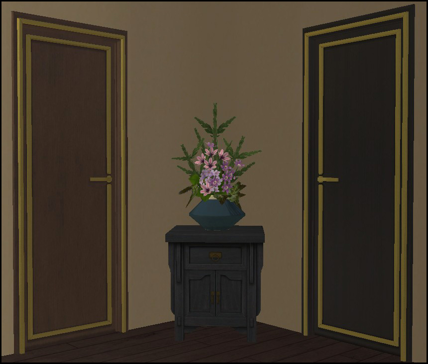 I did not recolor the metal trim on these doors, only the wood part. It already has four different trim color options, and I'd think that that would be sufficient. I'm actually not sure if this is meant to be more of an interior or an exterior door. I guess it could be either. But I decided to take pics for the image above with the door on the shady side of a wall, outdoors. The colors will look slightly different in different lighting situations or if you use it as an interior door. To demonstrate, here are the Black and the Weathered Woodland Brown color, indoors: