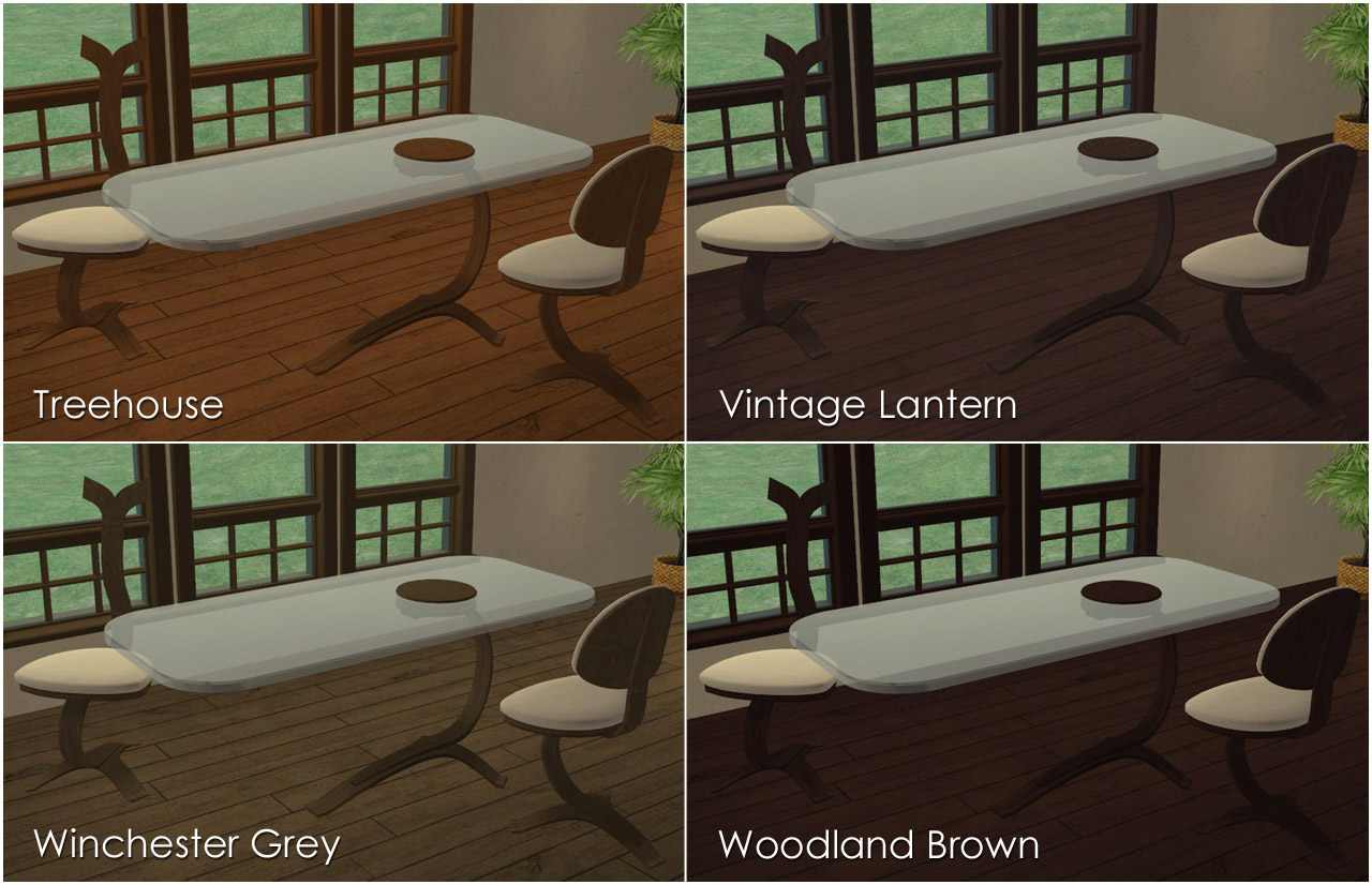 The other eight wood colors are attached in similar pics. I had a bit of fun with the grain patterns on these, since there's little wood to speak of on the pieces anyway. Each one is different and each is more randomly wavy/swirly than I usually make them. You can see it especially on the backs of the chairs. I only recolored the wood base of the table; the glass already comes in three different tints, which I think is sufficient.