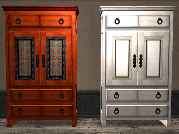 The Maxis name of this object is "Decorative House Armoire" - which I think is a teeny bit misleading as it is functional, not merely decorative as some objects are. Anyway, I digress. There are no subsets to this mesh. The color combos are as you see them. A PSD for easy recoloring of this mesh is available at my Dreamwidth.