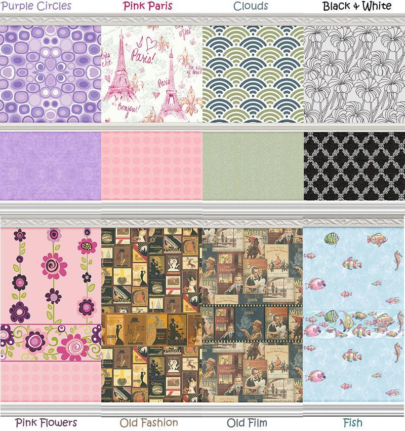 There are 8 Wallpapers, and 8 Carpets to mix & match with, they are all 100% seamless with realistic white skirting.