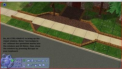 Also, the Maxis sidewalk clashed badly with the house, so I uploaded a few pictures with tacky Microsoft Paint-ed on instructions on how to fix the sidewalk.(Yeah, yeah, I know, my pics suck, but you guys get the point) It's basically Click-and-Drag with moveObjects on. I have also summarized the instructions in case they are hard to read/broken/eaten by llamas.