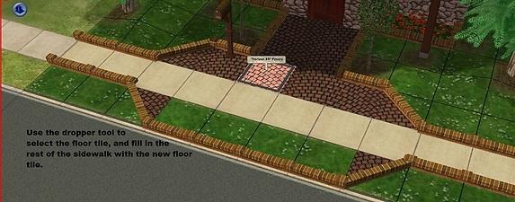 Use the Dropper tool to select the cobblestone flooring and paint over the Maxis sidewalk and grass bordering the road.