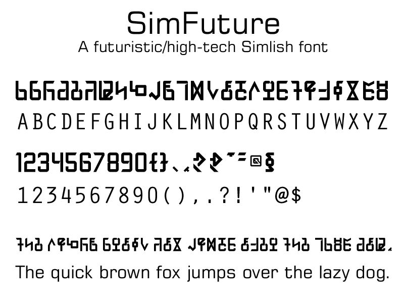 SimFuture is a TS3 Simlish font with a futuristic, high-tech style - the kind of thing you might see in a sci-fi movie poster, or an ad for some newfangled high-tech widget. It includes letters A-Z (upper and lower case are identical), numbers 0-9, and basic punctuation. SimFuture uses the same character assignments as immajer-Simlish, so text written in one font will remain consistent in the other.