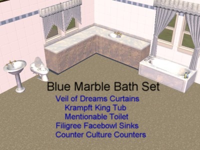 Well, had a little free time today so I decided to create some new bath sets. There are 4 subtly marblized bath sets in Blue, Pink, Green and Purple. Each set includes a recolor of the following: