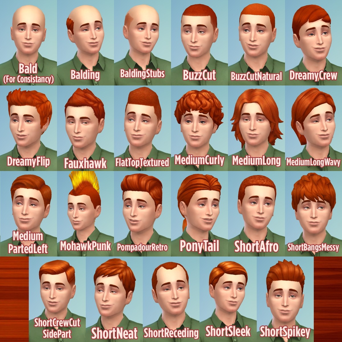 I've uploaded two collages containing, between them, preview pictures of all 23 hairstyles and 14 facial hair "styles" available to adult males in the game, so you can see what this color looks like on your favorite hair.