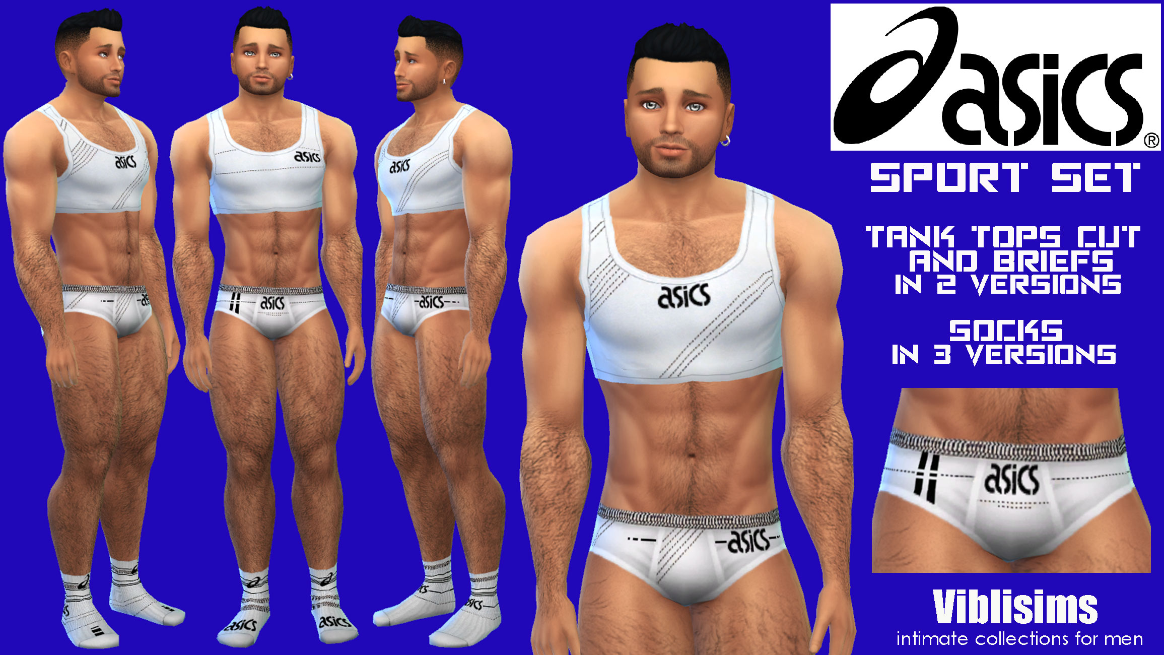 Considering how well the sims are dressed in sports clothes, I decided to continue with some additional clothing to sportswear and I chose the brand Asics, interesting and very modern in its simplicity. The sets are developed in two basic versions, both of white background, the first with a horizontal pattern and the second with a pattern oblique. Two versions of cut tank top and two of underwear, accompanied by three versions of socks, very faithful to the original of Asics. For sports sims who love to go to the gym or sleeping comfortable.