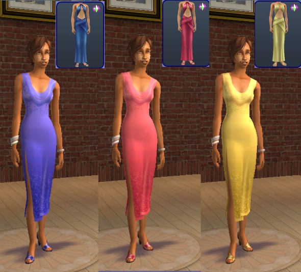 The replacement package uses the Blue, Yellow, and Cherry outfits from the Banana Evening Dress set by SweetAmberkins. Shoe sounds have been adjusted so that Sims wearing these outfits will sound like they are wearing heels. Like the Maxis originals, they are set as Formal only, and are available to adult and young adult females. Resources in the replacement package are compressed with SimPE. The mesh is by Liana, and is included in the rar as a separate file.