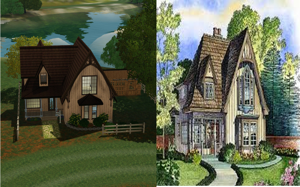 The location indicated on the map had a lot previously in that spot. I bulldozed it and put a smaller lot in its place to lower the price of the cottage. Price with the lot is: 21,558 This home was based off of a starting price of 22,000 Simoleons. A family of that size would consist of approx. 2 YA-Elder, 1 Teen, 1 Child, 1 Toddler/Baby 1 Horse or 2 Teen, 1 Child, 0 Horse. I chose to put as much of the cost into the exterior of the home and left only the necessities for the sim to live inside the house. There was no CC used in this lot. 1 Item from Midnight Hollow from EA Store: