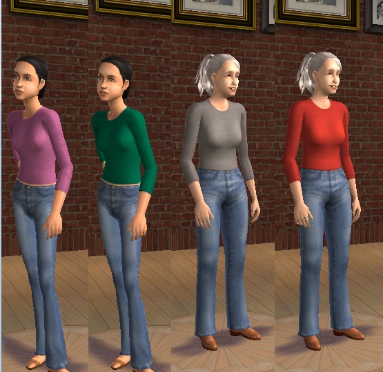 The teen outfits use the Maxis tftopmidsleevetshirt mesh, but will work with CatOfEvilGenius's edited replacement mesh, which is what I used for the teen screenshots. The elder packages require Cat's elder conversion mesh for ftopmidsleevetshirt. Per Cat's policy, that mesh is not included; if you do not have it, you will need to go to that thread to download it.