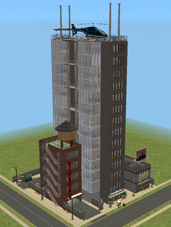 The only building whose main entrance opens directly onto the main road is the central skyscraper, and unsurprisingly, it is designed to be much higher on the socioeconomic ladder than any of the other structures. That being said, the ground floor is largely given over to a loading dock and employee workroom, accessed by the rear alleyway, as the people needed to operate a building like this are not going to be well-off enough to afford to live in it, and the buildings actual occupants, once again, would prefer not to have to see them unless absolutely necessary. The staff areas are accessed via the rear of the building, off the alleyway, while the main entrance used by residents and visitors fronts right onto the main road, allowing Sims to walk from the building directly to a cab, without having to actually walk through the areas surrounding it, once again illustrating the insulation from the problems of those less well-off, and making it easier to perpetuate the idea that one's own standard of living is "normal," and what pretty much everyone else experiences as well. Thus, the "public spaces" of the ground floor are pretty much limited to the lobby that opens onto the main road, and Sims must take the elevators (residents only) to reach the higher floors, creating a self-imposed isolation for residents.