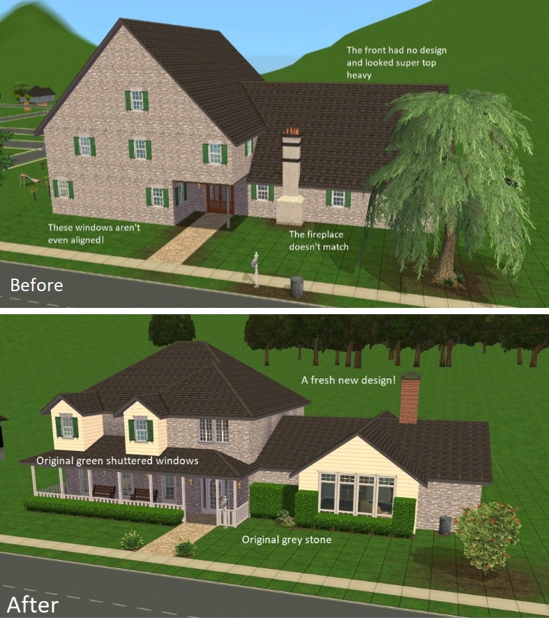 This house was just a mess. The roof was too big; the windows were completely unaligned; the front was all boring and flat, and the whole thing looked top heavy. In my remake, I kept some of the original green shuttered windows and the grey stone. I tried to make the aesthetic like how I think a house called "the grand estate" would look.