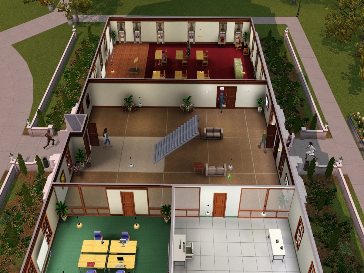 The Student Union and Library lots should also now be editable (you may need to unlock the lots first). Adding doors or changing doors to arches shouldn't interfere with sims routing to the lots since this package only takes into account doors that connect directly to the outside instead of every door on the lot. Before, it seemed as though the doors layout was remembered and changing anything would break routing. You do need to be sure that if you add doors connecting to the outside that they have clear access to the outer shell door as well. We haven't noticed any unusual behaviour using the Buy/Build On This Lot method to edit things, but some have reported this may be troublesome, so you might want to just go to Edit Town when you want to make changes. Also, beware of the little Event Lot Marker near the front entrance. You'll need to switch to "Orientation" layout to move objects that are hidden until Orientation begins so that they don't interfere with any edits made in the "Common" layout.