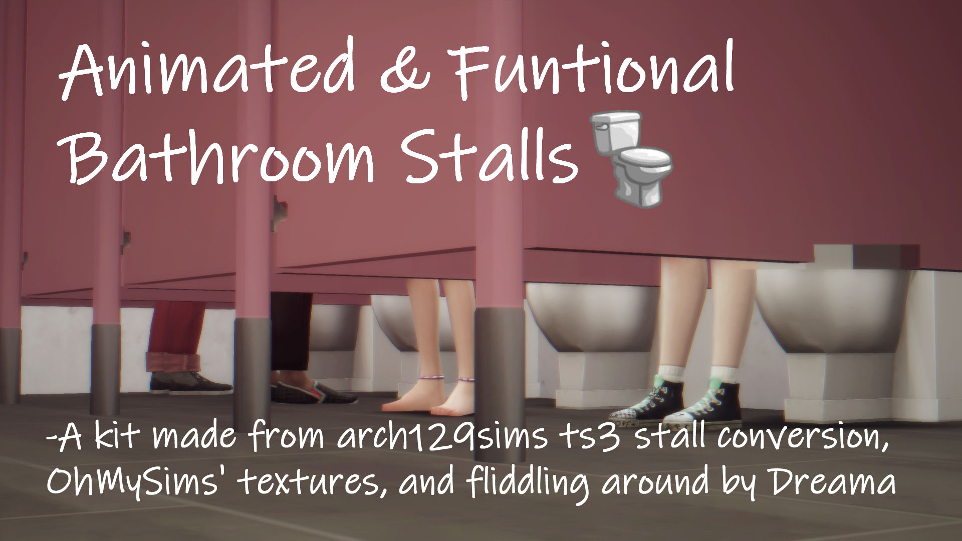 While browsing tumblr, I ran into Arch's bathroom stalls conversion (btw, that basketball hoop, wow), and it occurred to me that they could be functional if the toilet, stall, and door were separate objects. I had used OhMySims' stalls before, but it bothered me that sims just phased through the stalls, so I wanted to fix that. I did not feel comfortable messing with OhMySims' stuff without permission, but Arch's TOU permitted modifying his stuff, so I used his mesh to make my kit. However, once I was done I really wanted more colors for the stalls and OhMySims had recolored them in such a beautiful palette, I went ahead and included their swatches since their item had broken some time back. I did try to contact them several months ago for permission, but I never heard back so I just hope including the swatches is okay. The TOU did not mention anything about object updates. If I'm contacted about it by them I'll remove the color swatches.