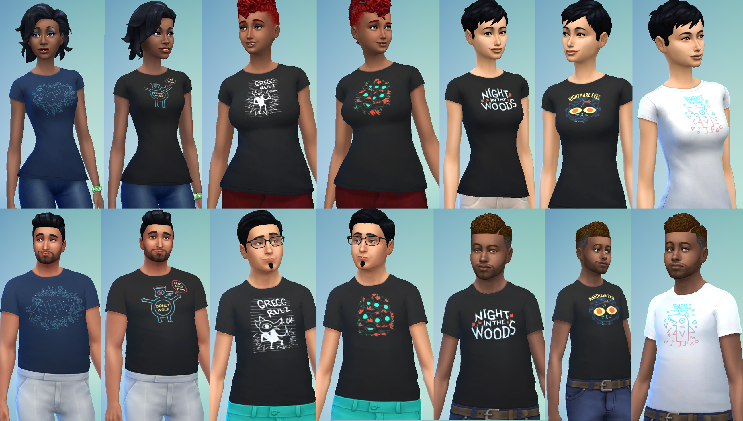 This download includes almost everything you can get from the official merch store, for both masculine and feminine sims! Which means: