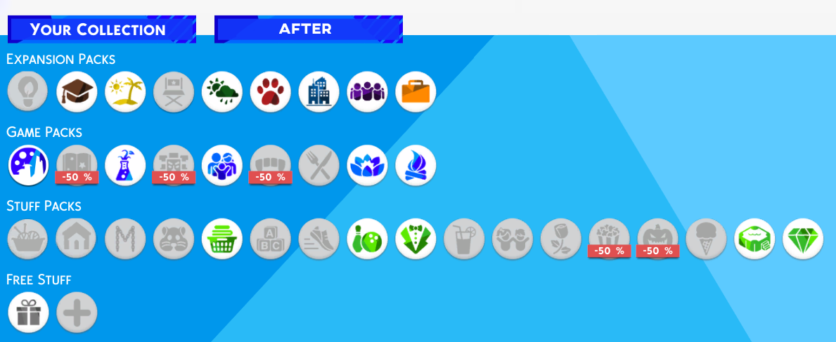 Updated to include: Eco Lifestyle, Nifty Knitting, Star Wars: Journey to Batuu, and Tiny Living DLC icons.