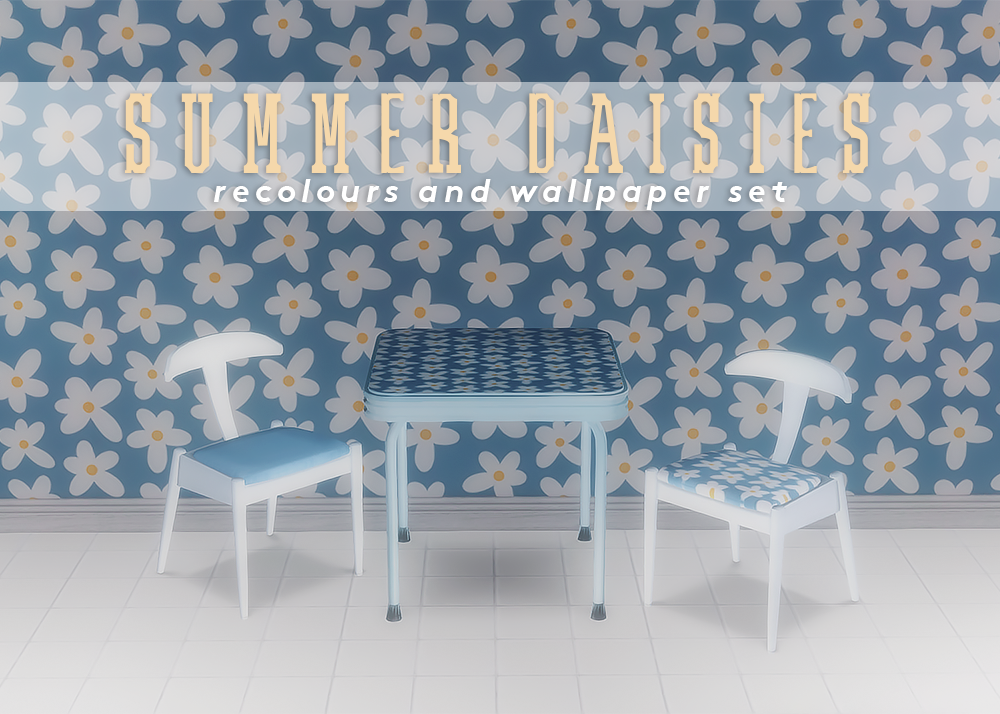 All downloads are base-game compatible! Included is a wallpaper set, recolours of the NuMica Allinall Card Table, and recolours of the Zecutime Social Chair.