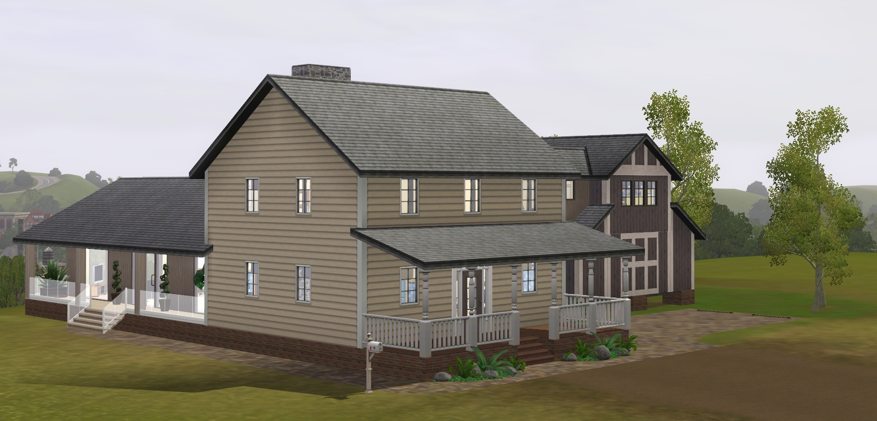 I’ve played Juan Darer once or twice, and made minor changes to his home, but it wasn’t until earlier this year, when one of my Sims visited his house for an opportunity, that I realised how great the location is, with possibly the best views in Twinbrook. (Incidentally, how did the swamp manage to ‘encroach’? It must be at least a hundred feet below.) So, many Sim-years after Juan’s death, I bought his house and rebuilt it for the family I’m currently playing. The exterior of the barn has been left unchanged, apart from being cleaned and re-roofed. The interior has been redesigned to house a gym, an art studio and a workshop downstairs, and two bedrooms upstairs. The rest of the house was dictated by the shape of the existing foundations and by having once been a farmhouse. So it ended up as a rebuilt traditional farmhouse, with a kitchen/family room downstairs and the master suite (complete with sitting room and home office) upstairs. An extension in a more modern style, with large windows to make the most of the views, provides space for entertaining, while a second, narrow, extension links the house and barn. The pond has been drained and the spawner removed, since the same fish are available in the lake.