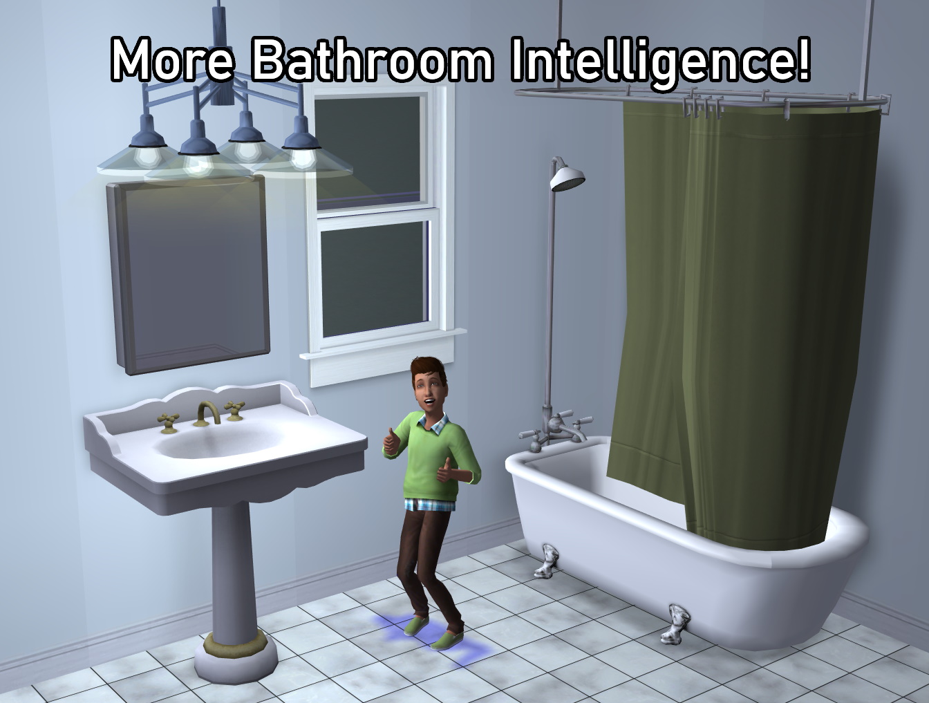• TwoJeffs' Autonomous Bath Fixes are also not compatible with my mod. Their mod's goal was to pretty much disable bathing unless comfort is low, a suitable shower is in use, or the Sim is pregnant. You could regard it as an alternative approach, but I was not happy with how TwoJeffs did it, personally.