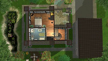 So this is quite a small, two story house with a garage, perfect for a single sim or a couple. The first floor is mostly one open space that includes a kitchen and a living room.