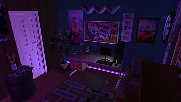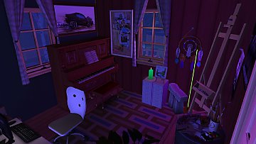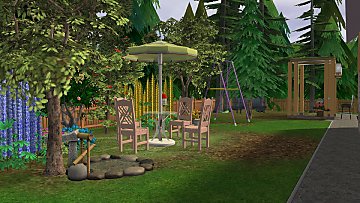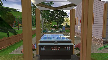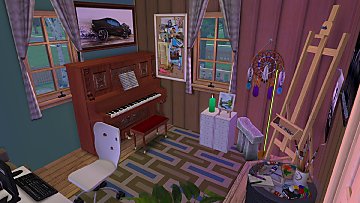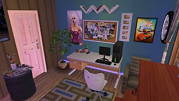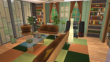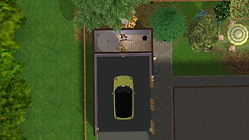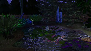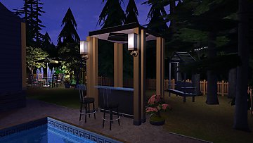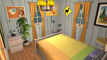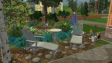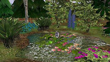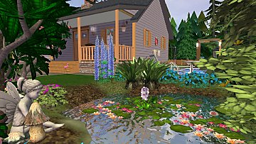 There's one bedroom, one bathroom, a really pretty living room (seriosly, I'm very proud of it), and an office/art room. The yard is filled with a pool, a couple of chillin' zones, a pond, a garage with an attached shed to keep all the garden clutter in, and lots of bushes. I really tried my best to keep it minimalistic (especially because even tho I love plants, I suck at taking care of them