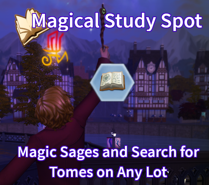 Search for tomes in a magical library in Windenburg! Or train with the Sages at a spellcaster high school in Copperdale! This "Magical Study Spot" Lot Trait can be added to any community lot (other than Magic HQ) to add the following functions: