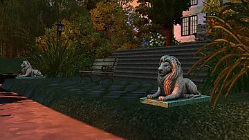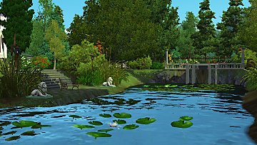 I was really torn on whether to fully furnish the place or not and I decided to keep it partially furnished to give players an idea of how each room was used. The house has four bedrooms (again, it used to be a rehabilitation center for kids), five bathrooms, an office room on the third floor (which was a late addition to the manor according to my own lore), a few spacious halls, a kitchen, a dining room, a living room, and a room that could possibly be a library in the past. Outside, there's lots of greenery, a little decorative tower, a garage, a pond with a cute little bridge, and two lion statues that are a signature feature of the real-life version of the place.