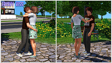 • Smooch: Becomes available when the conversation state is Very Alluring. The sims need to have at least 60 relationship points in order for it to succeed. Can also act as a first kiss.