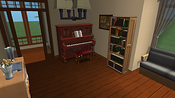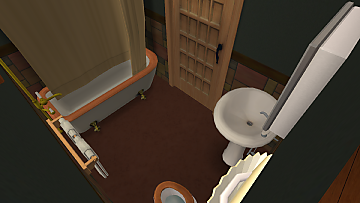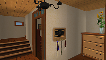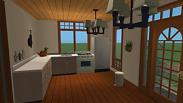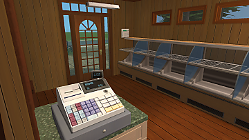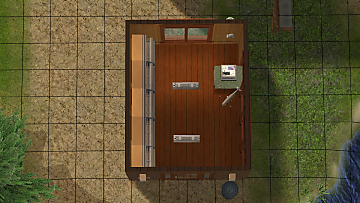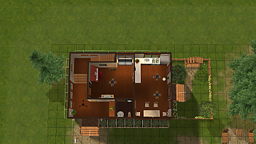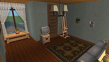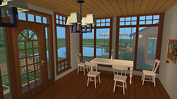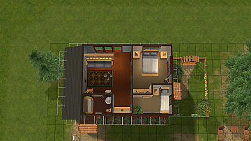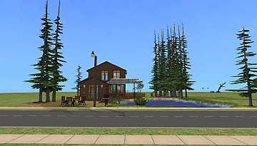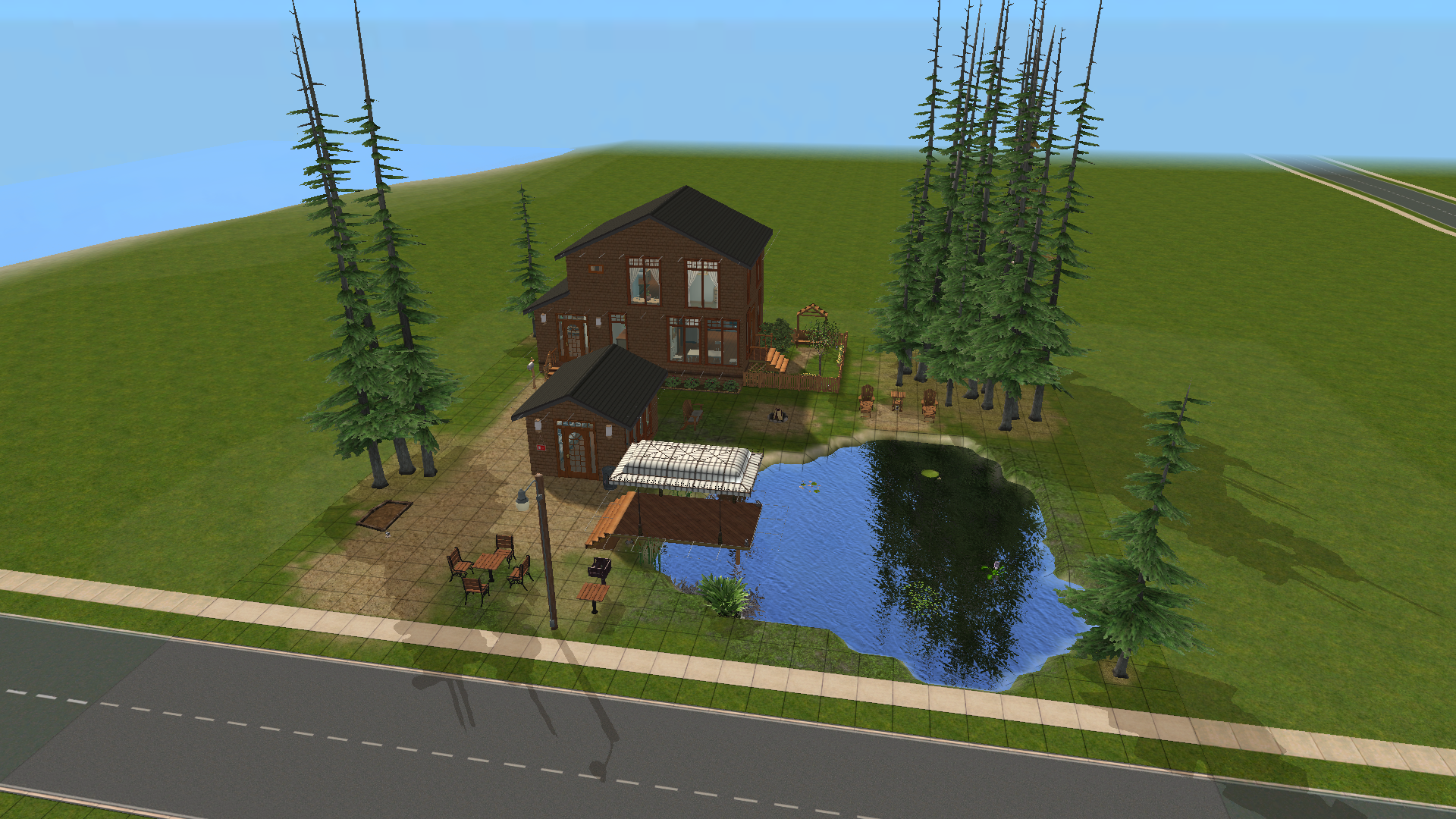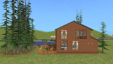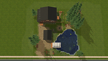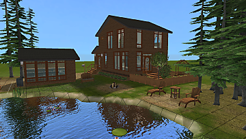 The lot also contains a small outbuilding intended for use as a home business selling freshly caught fish. It contains a cash register and five decra-chill display cases. There is also a bbq grill and a campfire for those looking to spend some more time outdoors. A covered dock overlooks the lake that sims are able to fish off of. Sims can dig for worms at the dirt patch across from the dock, and an outhouse can be placed nearby to avoid having visitors tramping through the house to use the bathroom.