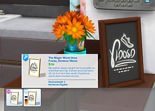 | This tuning mod makes The Magic Word Shoe Frame from the Grange Mudroom Kit functional. This clone of the original picture adds options for allowing shoes, removing shoes, or wearing slippers indoors. The original item itself has not been changed. The kit is still required.
