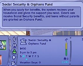 Social Security & Orphans Fund is a different version of the Government Support career, made for teens and elders. Your Sim will receive a weekly payment of 450 Simoleons every Monday.