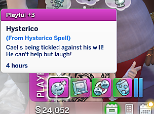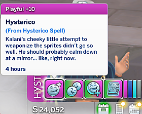 Hysterico is a spell that applies a +3 playful buff on the target sim. This spell can be learned from it's tome, or by joining The Order of Enchantment, and clicking the special interaction on the stone alter. The +3 playful moodlet is harmless, making the sim laugh while surrounding them with sprites only visible to The Order of Enchantment. However, the charged version will cast a +50 hysterical buff on the target sim, resulting in death from laughter.