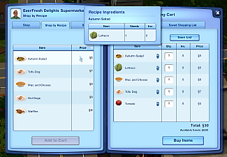This is a script mod to fix the EA oversight where a household needs to cook any recipe at least once for anything to show up in the Shop by Recipe tab of a Grocery Store. It also optionally adds Quick Meals to the Shop by Recipe tab if ani's No Fridge Shopping mod is installed. It should work with all custom recipe mods.